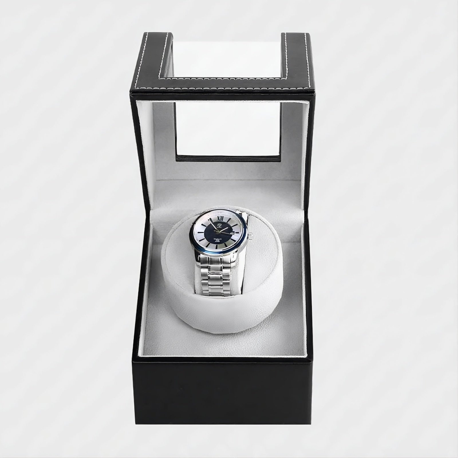 Si eres coleccionista de relojes automáticos, sabes que lo más molesto es tener que ajustar la hora y la fecha cada vez que dejas de usar tu reloj un par de días. Nuestra Caja Giratoria (Watch Winder) está diseñada específicamente para mantener la cuerda de tu reloj de forma constante y segura, imitando el movimiento natural de la muñeca.