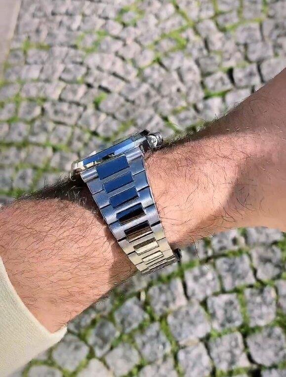 Am Handgelenk macht die Uhr richtig was her. Das schwarze Zifferblatt bildet einen tollen Kontrast zum weißen Logo und das Armband ist sehr robust. Ich bin glücklich mit der Uhr.