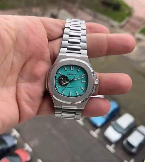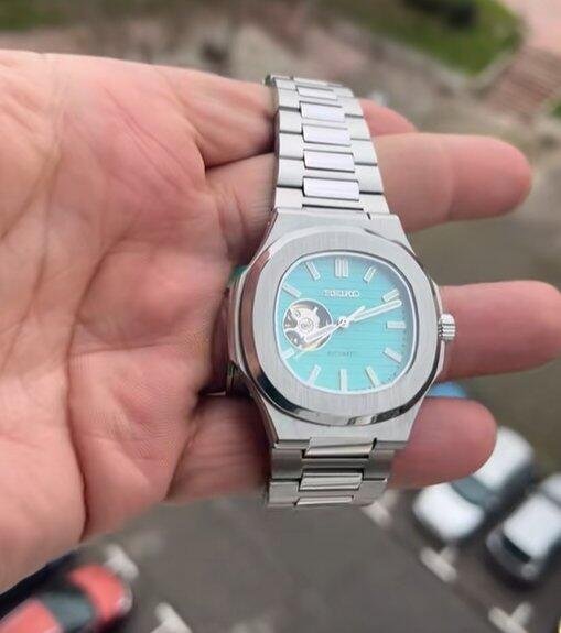 Llamativo el color, es un turquesa que no deja indiferente a nadie. El movimiento se ve por el agujero del dial y también por atrás. La correa viene con muchos eslabones.