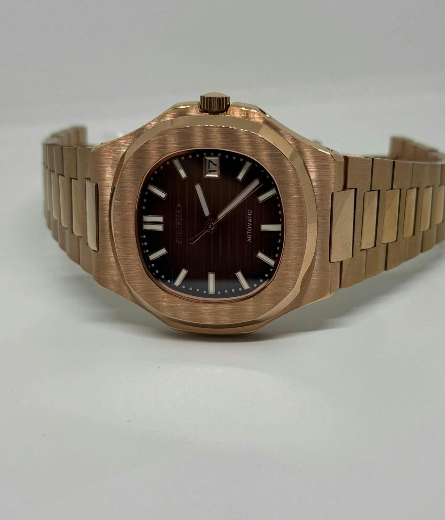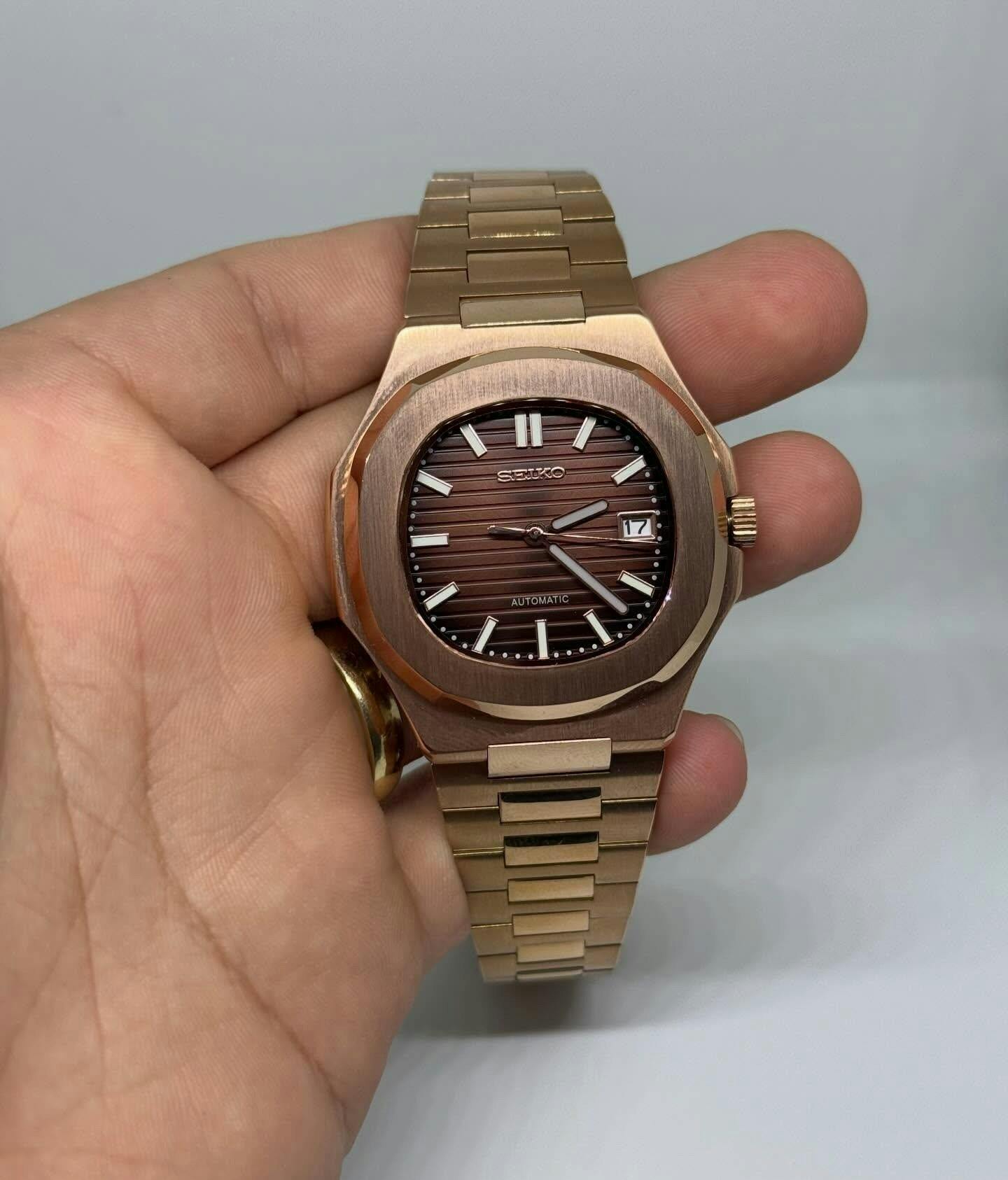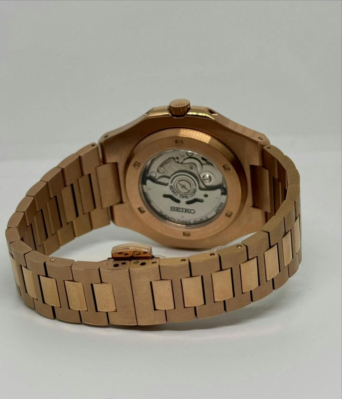 Mi primer mod en oro rosa, elegante y el movimiento se ve por la parte de atrás. Me han incluido caja y una herramienta para quitar eslabones. La he usado y sin mayores complicaciones. Todo genial.